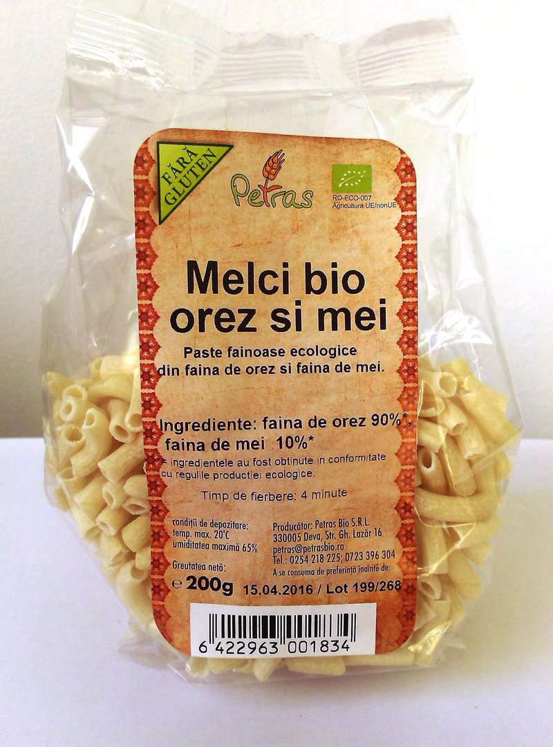 Melci din orez si mei ECO-BIO fara gluten 200g – Petras Ingrediente: faina de orez 90%, faina de mei 10% Timp de gatire: 4 minute Melci din orez si mei ECO-BIO fara gluten 200g – Petras