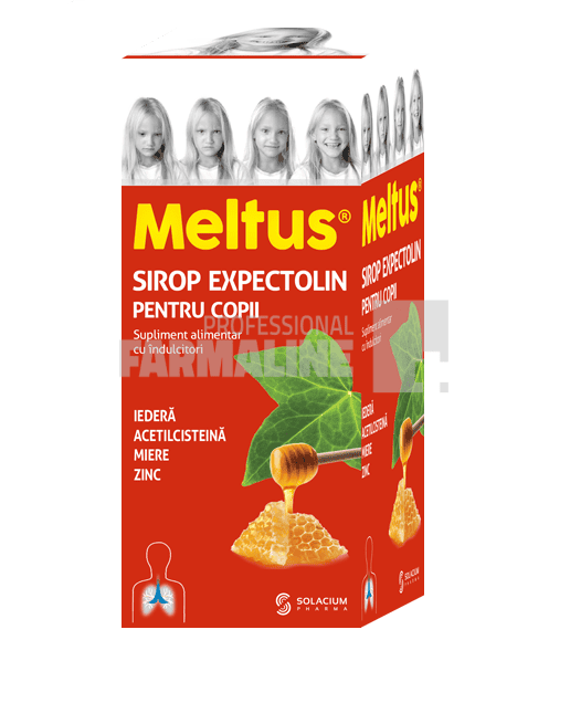 DescriereMeltus Expectolin este un sirop de tuse cu o combinatie unica de ingrediente ce actioneaza sinergic, imbinand intr-un singur produs proprietatile medicinale ale componentelor sale (iedera, acetilcisteina, miere, zinc) si este recomandat in tusea productiva.Formula creata special pentru copii, incepand de la varsta de 2 ani, combate eficient tusea productiva si favorizeaza expectoratia.Mod de administrareCopii intre 2 si 4 ani – 1 lingurita (5 ml sirop) de 2 ori pe ziCopii de 4 ani sau mai mari – 2 lingurite (10 ml sirop) de 2 ori pe ziProducatorSolacuim PharmaMod de prezentareFlacon 100 ml