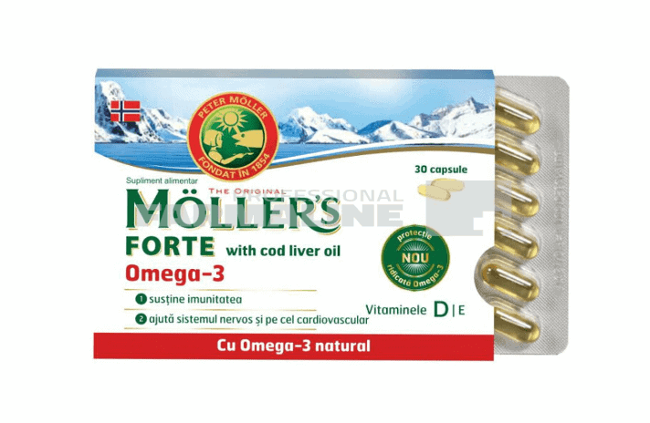DescriereMoller’s Forte Omega-3 with Cod Liver Oil furnizează aportul zilnic necesar de Omega-3 și de vitaminele D și E. Combinația ideală de ulei de pește concentrat și de cel mai pur ulei de ficat de cod arctic norvegian.EPA și DHA contribuie la funcționarea normală a inimii. DHA contribuie la menținerea vederii normale și a funcției normale a creierului. Vitamina D contribuie la funcționarea normală a sistemului imunitar și la menținerea sănătății sistemului osos și a dinților. Vitamina E contribuie la protejarea celulelor împotriva stresului oxidativ.CompozitieUlei de peste concentrat, ulei de ficat de cod, acizi grasi Omega 3, DHA, EPA, vitamina D, vitamina E. Mod de administrareDoza zilnică recomandată pentru adulți și copii cu vârsta peste 6 ani – 2 capsule / zi cu o cantitate suficientă de lichid.ProducatorPeter MollerMod de prezentareCutie cu 30 capsule
