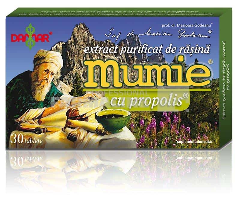 DescriereExtract purificat de rășină Mumie cu Propolis este un complex naural cu efecte sinergice, care înglobează într-un singur produs proprietățile imunomodulatoare, tonice și regeneratoare ale rășinei Mumie și proprietățile bio și imunostimulatoare, antitoxice, antibiotice si antivirale ale propolisului. Prin asocierea rășinei Mumie cu propolis este potențată acțiunea sinergica a tuturor principiilor bioactive prezente în cele două componente în lupta împotriva diverselor afecțiuni.Rășina Mumie este cunoscuta și utilizată de aproximativ 3000 de ani în peste 50 de afecțiuni. Această rășină se găsește în munții Podișului Tibet și Pamir, la înălțimi de peste 2000-5000 de metri. Se prezintă sub o formă vâscoasă, având culoarea brun închis și un gust amar. Rășina Mumie este cunoscută sub diverse denumiri: balsam de munte, sucul stâncilor, ulei de munte, sângele munților, etc.Propolisul este un produs de digestie al albinelor și este cules de pe mugurii de plop și arin, de pe frunzele, mugurii și scoarța coniferelor și a plopilor, a salicaceelor (salcii) și a prunilor. Producerea lui este concomitentă cu cea a mierii și este realizată de către albinele specializate. Produsele rășinoase recoltate de albine, de pe speciile mai sus enumerate, sunt amestecate cu secreții salivare și ceară. Propolisul se prezintă sub o formă solidă, cu aspect de rășină și o culoare care variază între negru, maro și verde.Mod de administrareSe ia intern, în funcție de greutatea corporală, după cum urmează:- până la 70 kg – 0,2 gr. de 2 ori pe zi Între 70-80 kg – 0,3 gr. de 2 ori pe zi;- intre 80-90 kg – 0,4 gr. de 2 ori pe zi Peste 90 kg – 0,5 gr. de 2 ori pe zi.Durata unei cure: 25-30 de zile.În cazul bolilor grave sau cronice cura se va repeta după o pauză de 5-10 zile.ProducatorDamarMod de prezentareCutie cu 30 tablete