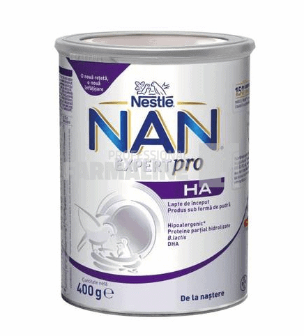 DescriereNAN® EXPERTPRO HA este un lapte de inceput pentru sugarii sanatosi, care poate fi folosit de la nastere, atunci cand acestia nu pot fi alaptati. Asigura sugarului toti nutrientii esentiali pentru dezvoltarea sa normala fizica si mentala. Prin combinatia sa unica de ingrediente, NAN® EXPERTPRO HA reduce riscul de alergie in primii ani, cei mai importanti din viata.NAN® EXPERTPRO HA este indicat in special sugarilor cu risc de a dezvolta alergii (de exemplu, daca un alt membru al familiei este alergic).Totusi, daca sugarul tau are deja alergie la proteinele laptelui de vaca, nu folosi NAN® EXPERTPRO HA fara a consulta medicul. Introducerea in alimentatie a oricarei formule de lapte sau a laptelui de vaca trebuie facuta numai sub supraveghere medicala.Beneficii:Dovedit clinic ca reduce riscul de a dezvolta alergii la proteinele din lapte;lactis – sunt culturi similare cu cele care exista si in flora intestinala a sugarilor alaptati;Proteine partial hidrolizate – este un amestec optimizat de proteine hipoalergenice, atat din punct de vedere calitativ, cat si cantitativ, obtinut printr-o tehnologie speciala care reduce considerabil potentialul alergenic al laptelui de vaca.Contine DHA, unul dintre acizii grasi regasiti si in laptele matern.CompozitieLactoza, uleiuri vegetale (floarea soarelui cu continut ridicat de acid oleic, cocos, rapita cu continut scazut de acid erucic, floarea soarelui), izolat de proteine hidrolizate din zer, concentrat de proteine hidrolizate din zer, minerale (citrat de potasiu, glicerofosfat de calciu, fosfati de calciu, clorura de magneziu, clorura de calciu, clorura de sodiu, sulfat feros, sulfat de zinc, sulfat cupric, sulfat de mangan, iodura de potasiu, selenat de sodiu), aminoacizi (L-arginina, L-histidina, L-tirozina), ulei de peste, bitrat de colina, ulei de Mortierella alpina, vitamine L- ascorbat de sodiu, D-pantotenat de calciu, nicotinamida, acetat de tocoferil DL-alfa, ribofllavina, monohidrat de tiamina, acetat de retinil, clorhidrat de pirixodina, acid folic, filochinona, D-biotina, colecalciferol, cianocobalamina, inzitol, taurina nucleotide, uridina 5′- acid fosforic, adenozina 5′- acid fosforic (AMP), guanozina 5′- acid fosforic (GMP), L-carnitina, culturi de Bifidobacterium Lactis.Mod de administrareSpalati-va pe maini inainte de a pregati laptele pentru sugari. Spalati bine sticla, tetina si capacul pana nu mai raman urme de lapte, fierbeti-le timp de 5 minute apoi lasati-le acoperite pana la folosire. Fierbeti apa potabila timp de 5 minute, apoi las-o sa se raceasca pana la aproximativ 40°C (pentru a pastra numarul de culturi vii, apa fiarta trebuie racita pana la aproximativ 40°C inainte de a adauga pudra). Consultati si urmati modul de administrare. Mai intai turnati exact cantitatea de apa necesara in biberon, apoi adaugati numarul exact de masuri rase corespunzator varstei sugarului folosind doar masura din interior. Inchideti bine cutia dupa fiecare folosire. Inchideti biberonul si agitati bine pana cand pudra s-a dizolvat complet. Verificati temperatura inainte de hranire.ProducatorNestleMod de prezentareCutie 400 g