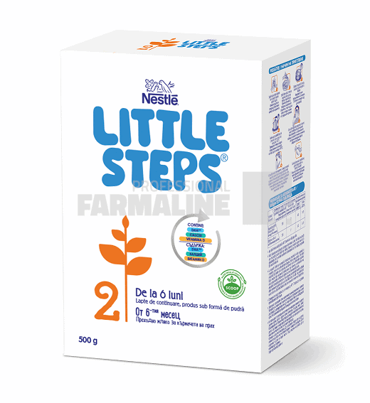 DescriereCopiii de varsta mica au nevoie de mai multa energie in comparatie cu adultii, raportat per kg corp (greutate), datorita cresterii rapide si a nivelului de activitate fizica. De aceea este bine ca dieta copiilor de varsta mica sa furnizeze toti nutrientii necesari in cantitati suficiente pentru a asigura o dezvoltare normala si energie suficienta pentru joaca si invatare.Contine Calciu si Vitamina D, necesare pentru cresterea si dezvoltarea normala a oaselor copiilor.Vitaminele A, C si D contribuie la functionarea normala a sistemului imunitar.Fierul contribuie la dezvoltarea cognitiva normala a copiilor.LITTLE STEPS™ 3 nu este un inlocuitor de lapte matern.CompozitieLapte degresat, maltodextrină, uleiuri vegetale (floarea soarelui cu conținut ridicat de acid oleic, rapiță cu conținut scăzut de acid erucic, floarea soarelui), permeat demineralizat din zer, lactoză, minerale (citrați de calciu, citrat de sodiu, citrat de potasiu, fosfați de potasiu, sulfat feros, sulfat de zinc, iodură de potasiu), emulgator lecitină din soia, vitamine [L-ascorbat de sodiu (vitamina C), riboflavină (vitamina B2), acetat de retinil (vitamina A), colecalciferol (vitamina D), cianocobalamină (vitamina B12)].Mod de preparare:1. Spala-te pe maini inainte de a pregati laptele pentru copilul tău. 2. Spala bine toate părțile componente ale cănuței până nu mai rămân urme de lapte.3. Fierbe-le timp de 5 minute. Lasa-le acoperite pana la folosire.4. Fierbe apa potabila timp de 5 minute, las-o apoi sa se raceasca (~40°C).5. Consulta modul de preparare si toarnă exact cantitatea de apă necesară.6. Consultă modul de preparare; adaugă numărul exact de măsuri rase corespunzător vârstei sugarului. Folosește ligurița dozatoare din cutie.7. Închide bine capacul și agită bine cănuța până când pudra s-a dizolvat complet.Produsul trebuie consumat in maxim 3 saptamani de la deschiderea cutiei.ProducatorNESTLEMod de prezentareCutie 500 g