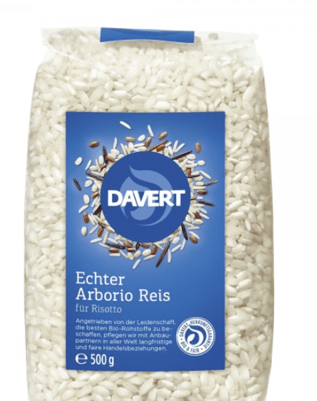 Orez alb Arborio pentru risotto, eco-bio, 500g – Davert Orez Davert Real Arborio pentru risotto bio. Orezul Arborio contine boabe de orez groase, albe, care capata minunat gustul bulionului care face risotto. Amidonul de orez tine impreuna boabele si alt