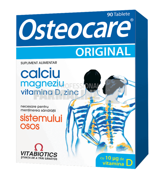 DescriereOsteocare® a fost conceput stiintific pe baza de studii si contine calciu, zinc, magneziu, vitamina D3, dar si cupru, mangan, seleniu, bor, elemente care sunt necesare pentru mentinerea sanatatii sistemului osos.Obtinerea necesarului de calciu este importanta pentru barbati si femei de toate varstele, in special in timpul sarcinii si alaptarii, dar si in perioada de menopauza.Formula echilibrata cu magneziu Osteocare® furnizeaza o sursa naturala de calciu echilibrat cu magneziu si vitamina D, care contribuie la functionarea normala a sistemului muscular.Toate suplimentele de la Vitabiotics sunt produse sub inalte standarde de calitate si control (GMP – Good Manufacturing Practice) si ofera suport optim prin formule echilibrate ce nu expun la supradozare.CompozitieVitamina D (D3 400 UI) 10 µg, Calciu 800 mg, Magneziu 300 mg, Zinc 10 mg, Cupru 1000 µg, Mangan 0.5 mg, Seleniu 50 µg, Bor 0,6 mg.Mod de administrareAdulti: 2 tablete pe zi, la masa principala.Inghititi cu apa sau cu alt lichid rece. A nu se mesteca. A nu se depasi doza recomandata pentru consumul zilnic.Osteocare® poate fi luat atat timp cat este necesar si se poate administra impreuna cu alte produse din gama Vitabiotics.ProducatorVitabioticsMod de prezentareCutie cu 90 tablete