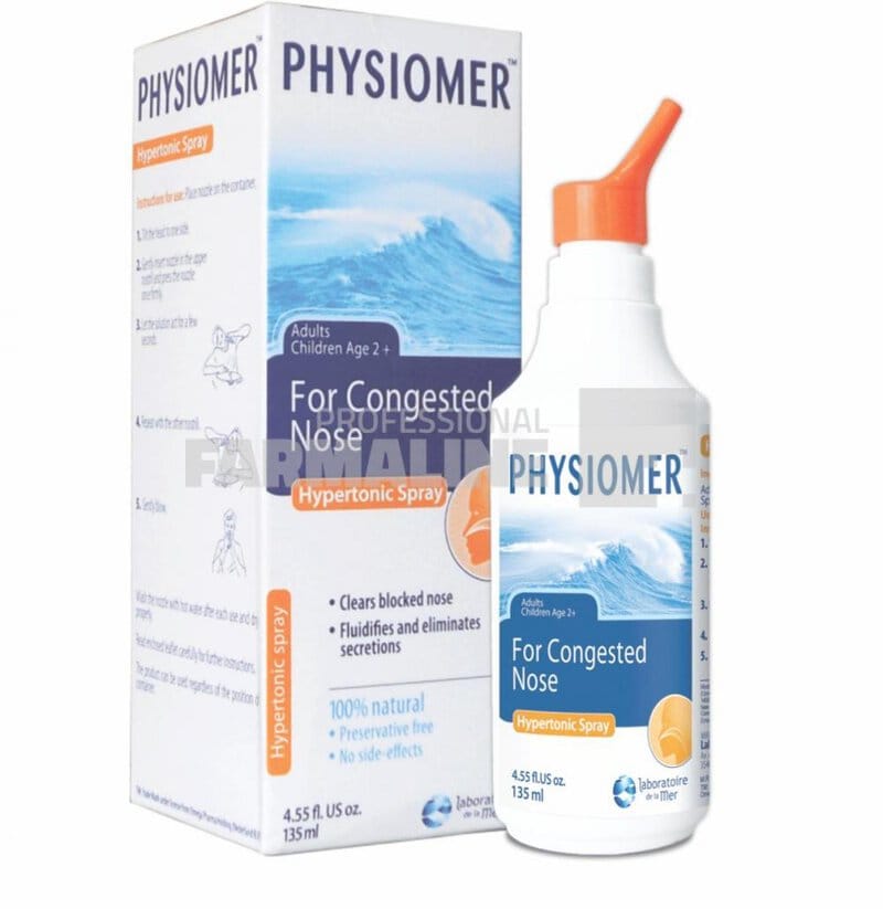 DescrierePhysiomer Hipertonic este un produs conceput sa inlature congestia nazala in caz de raceala, sinuzita si alergii, sa reduca inflamatiile nazale si sa deblocheze caile respiratorii infundate. Datorita naturii sale hipoalergenice si proprietatilor specifice de regenerare celulara, nu irita nici cele mai fragile mucoase ale cailor nazale.Compozitie100% apa de mare hipertona, naturala, nediluata, sterila și fara conservanti.Mod de administrareO pulverizare timp de 1-2 secunde în fiecare nară, de 2-3 ori pe zi.ProducatorOmega PharmaMod de prezentareFlacon 135 ml