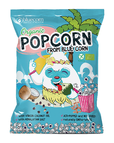 Floricele albe, crocante si gustoase din porumb albastru (fara OMG) expandat, nu prajit in ulei, cu adaos de ulei de cocos extra virgin si un praf de sare de Himalaya.