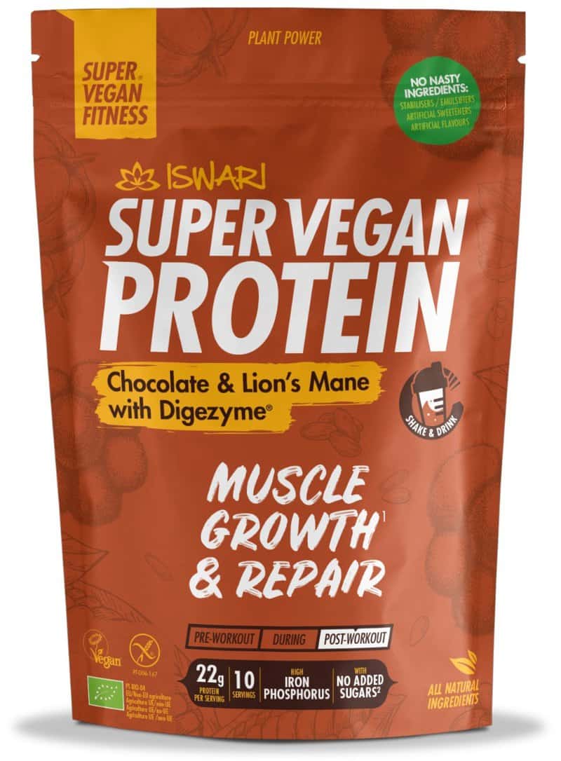 Proteina Super Vegan bio (dupa efort) ciocolata si coama leului cu DigeZyme de la Iswari este ideala pentru a fi consumata dupa efort, reprezentand o varianta ideala si naturala pentru cresterea masei musculare si pentru intretinerea sistemul imunitar.