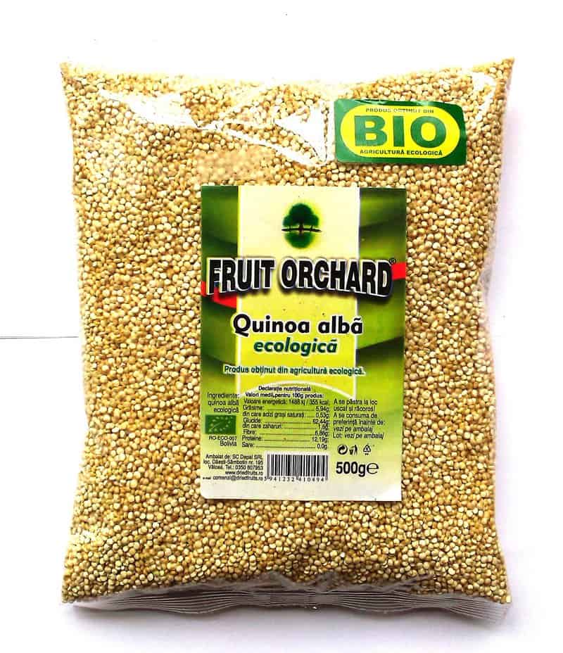 Quinoa alba 500g ECO-BIO – FRUIT ORCHARD Quinoa are un gust si un aspect excelent fiind foarte sanatoasa dar si acceptata de catre intreaga familie. Copiilor le place foarte mult quinoa datorita aspectului ei unic atunci cand e preparata (boabele pleznes