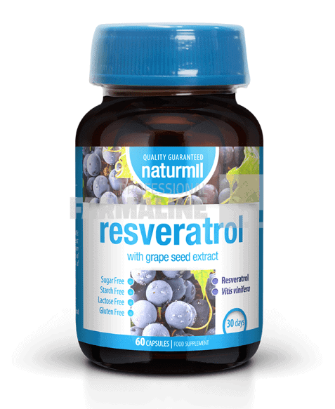 Descriere Antioxinat natural ce ajută la protejarea sistemului cardiovascular și la reducerea efectelor îmbătrânirii. • conține Resveratrol, 20 mg/capsulă • garantat 80% polifenoli din extract din sâmburi de strugure Resveratrolul este un compus din clasa polifenolifol, regăsibil în sâmburi și coaja de struguri în cantități considerabile, dar și în fructe de pădure, alune și o serie de legume. Principalul rol al resveratrolului este de a proteja planta de secetă, radiații UV sau dăunatori precum bacterii și fungi.În consumul uman a fost cunoscut psub denumirea de “paradox francez”, cu referire la rata scăzută de afecțiuni metabolice și obezitate în rândul francezilor, în ciuda bucătăriei bogate în lipide, efectele benefice fiind asociate consumului de vin roșu.Contribuie la: • susținerea sănătății cardiovasculare: ◦ favorizează creșterea nivelului de oxid nitric din organism ◦ reduce valorile presiunii sangvine sistolice ◦ protejează structura vaselor de sânge ◦ reduce nivelului de LDL-colesterol ◦ normalizează fracțiunile de colesterol HDL – LDL ◦ impiedică peroxidarea lipidelor și depunerea lor sub formă de placă de aterom • reducerea rezistenței la insulină • susținerea sănătății sistemului reproducător masculin și feminin • inhibarea dezvoltării anormale a hormonilor androgenici • normalizarea creșterii țesutului endometrial • îmbunătățirea producției de ovocite la nivelul ovarelor și prelungirea funcționării sănătoase a acestora • menținerea sănătății funcțiilor cerebrale reducând evoluția afecțiunilor degenerative • inhibarea deviziunii anormale a celulelor tumorale și inducerea apoptozei • inhibarea proteinelor chemo-rezistente, sustinând și potentând efectele chimioterapiei • susținerea sănătății sistemului respirator mai ales împotriva afecțiunilor cornice date de poluarea urbană • reducerea efectelor îmbătrânirii • îmbunătățirea structurii și mobilității articulațiilor • amelioarea afecțiunilor inflamatorii de la nivelul pieliiCompoziție/ 2 capsule: Resveratrol 40 mgExtract din sâmburi de Strugure (garantat 80% polifenoli) 200 mgMod de administrare: Câte 1 capsulă de 2 ori/zi, la masa, sau conform recomandării consultantului de specialitate.ProducatorDietmedMod de prezentareFlacon cu 60 capsule