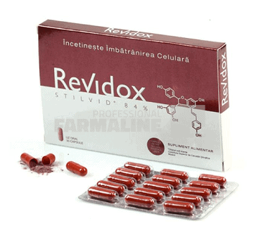 DescriereSusține-ți imunitatea cu Revidox!Comunitatea stiintifica medicala a evidentiat, printre altele, efectul benefic asupra inimii pe care il au unele ingrediente active prezente in vin, strugurele (Vitis vinifera) fiind unul dintre alimentele cele mai sanatoase pentru organismul uman datorita prezentei igredientului activ Resveratrol.Revidox este un supliment alimentar inovativ, de ultima generatie, 100% natural, care prin formula patentata Stilvid® 84% incetineste imbatranirea celulara si ajuta in preventia bolilor neurodegenerative si cardiovasculare. Este cea mai mare descoperire stiintifica a ultimilor ani impotriva imbatranirii celulare. Studiile clinice demonstrează că asocierea Revidox la tratamentul afecțiunilor neurodegenerative și cardiovasculare îmbunătățește statusul celular și susține imunitatea organismului.In plus Revidox contine si seleniu organic obtinut din drojdie care pe langa protectia celulara impotriva stresului oxidativ, ajuta la mentinerea aspectului sanatos al parului si unghiilor. de asmenea seleniul organic este valoros pentru ca sprijina functionarea normala a sistemului imunitar si a glandei tiroide. Extractul de rodie (Punica granatum) este bogat in antioxidanti solubili de tipul polifenolilor (punicalagine) cunoscuti si pentru rolul antiinflamator.Beneficii Revidox • ofera protectie la nivel celular, sustinand astfel imunitatea organismului • protejeaza materialul genetic (ADN), ferindu-l de mutatii• activeaza si stimuleaza familia de gene SIRT1 – gena “longevitatii” cu efect benefic asupra calitatii si duratei vietii• reduce semnele externe de imbatranire si ajuta organismul in combaterea “din interior” a procesului de imbatranire celulara• are efect protectiv in fata bolii Alzheimer si altor boli neurodegenerative (efect neuroprotector)• protejeaza sanatatea sistemului cardiovascular, imbunatateste functionalitatea fiziologica a inimii si vaselor de sange (efect cardioprotector si antitrombotic)• reduce stresul oxidativ cu 61.9%, • scade nivelul sanguin al colesterolului total (LDL) si al trigliceridelor • scade markerii inflamației, markerii tumorali/risc aterogen cu 9-26%CompozitieRevidox Stilvid 84% – contine principiile active prezente in mod natural in 45 kilograme de struguri (obtinut printr-un proces brevetat) alaturi de extractul de rodie si potentate de seleniu. Stilvid® extras integral din seminte de strugure 133 mg (resveratrol bioactiv 8 mg, antocianozidele 0.67 mg, procianidine 14.63 mg, flavonoide 0.4 mg, alte stilbene 1.3 mg). Extract uscat din fructe de Rodie 125 mg (punicalagini – acid elagic 8.75 mg, procianidine 3.75 mg). Drojdie de seleniu 50 mcg. Dioxid de siliciu 26 mg. Stearat de magneziu 16 mgMod de administrareIndicat pentru adulti. 1 capsula pe zi, minim 1 anProducatorActafarmaMod de prezentareCutie cu 30 capsule