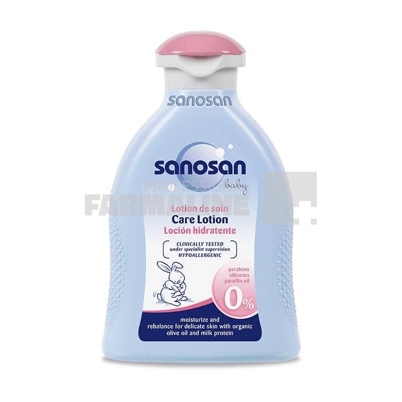 1.Sanosan Baby Spumant & Sampon 500 mlDescriereImbogatita cu extract organic de masline si proteine din lapte, aceasta formula de ingrijire blanda curata cu grija pielea bebelusului si a scalpului si da parului un luciu matasos. Pastreaza mantaua de acid natural a pielii delicate a copilului si sprijina functia de protectie naturala a pielii.  Compozitie Extract organic de masline si proteine din lapte. Formula naturala nu contine ulei de parafina, coloranti, siliconi sau parabeni. Compatibilitatea cu pielea a fost confirmat clinic.   Mod de administrare  In functie de marimea cazii, se adauga 2-4 pompe de sampon spumant in apa cazii incalzite la 36 de grade C si se spala usor copilul.   Producator  Mann & Schroder   Mod de prezentare Flacon 500 ml  2.Lotiune ingrijire 100 mlDescriere Lotiunea de ingrijre cu ulei de masline si proteina din lapte regleaza nivelul de hidratare al pielii aceasta devenind neteda si catifelata. Substantele atent selectionate raspund nevoilor pielii delicate, ingrijesc pielea bebelusilor, redandu-i supletea si elasticitatea. Protejeaza pielea impotriva uscarii si ajuta la vindecarea iritatiilor pielii delicate a bebelusilor.  Compozitie Ulei de masline si proteine din lapte. Produs testat clinic, fara coloranti, vaselina si ulei de parafina. Mod de administrare Încălziți o cantitate mică în palme. Utilizați mișcări circulare fără a aplica presiune pentru a aplica pe pielea bebelușului. Mod de utilizare Încălziți între palme o cantitate mică de loțiune. Utilizați mișcări circulare pentru a aplica pe pielea bebelușului, fără a folosi presiune. Producator   Mann&Schroder   Mod de prezentare   Flacon 100 ml