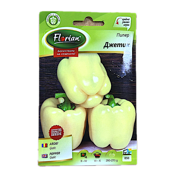 Seminte ardei gras Getic 1 gr, Florian Bulgaria. Soi foarte productiv, timpuriu de ardei tip dolma potrivit pentru productie atât in solare, cât si în exterior. Planta este foarte bine dezvoltata. Fructele sunt cu o forma usor alungita, cu 3-4 lobi, de culoare galben deschis, iar la maturitate ajung de culoare rosie. Potrivit pentru consum in starea proaspata.