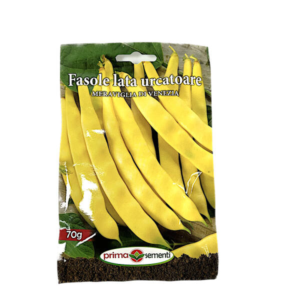 Seminte fasole lata urcatoare galbena Meraviglia di Venezia 70 gr, Prima Sementi. Soi tardiv cu pastaie plata, de culoare galbena. Pastaile ating 20-25 cm lungime, sunt carnoase si fara ate. Boabele sunt de culoare alba.