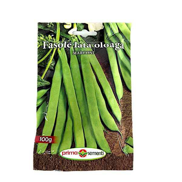 Seminte fasole urcatoare verde Marconi 100 gr. Producator: Prima Sementi. Soi timpuriu cu perioada de vegetatie de 62-65 zile. Soiul este apreciat pentru gustul si calitatea pastailor care sunt lungi, late, de culoare verde, fragede.