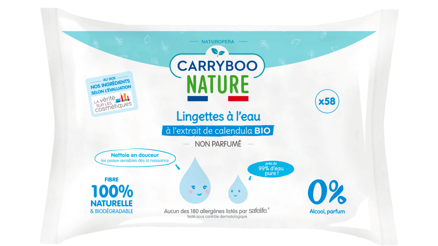Servetele umede pe baza de apa Carryboo sunt fara parfum si au extract de musetel care curata delicat si calmeaza pielea bebelusului, fiind recomandate in special pentru fata, mainile si fundul bebelusului.