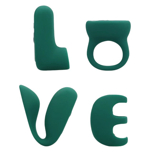 Set jucării erotice LOVELINE ‘Love’ (S)Explore Set, cu stimulator clitoris, vibrator de deget, vibrator pentru cupluri și inel de penis, verde Transformă orice moment într-o declarație de plăcere cu LOVELINE ‘Love’ (S)Explore Set – un pachet complet de jucării erotice conceput pentru joacă senzuală și explorare în cuplu sau solo. Fiecare literă din „LOVE” ascunde un accesoriu surprinzător: inel de penis, vibrator de deget, stimulator clitoridian și jucărie pentru cuplu – toate compatibile cu vibratorul bullet inclus. Este cadoul perfect pentru o ocazie specială! Caracteristici cheie