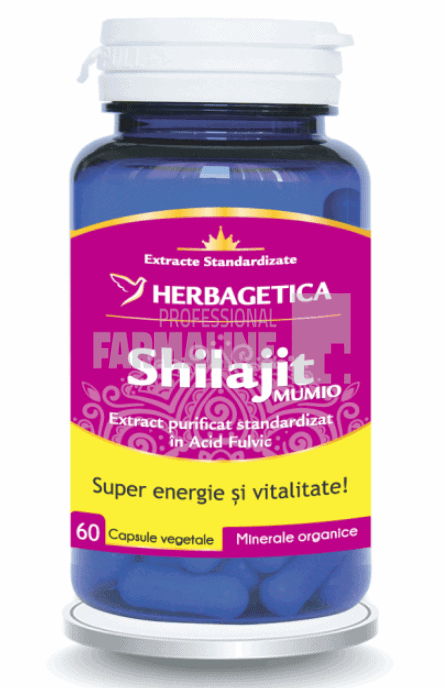 DescriereImunostimulator, revitalizant, energizant, neurogenerator.Beneficii- Întărește și rejuvenează sistemul imunitar;- Regenerator și întineritor al organismului;- Tonic nervos, antistres, susține buna funcționare a sistemului nervos;- Adaptogen, prin menținerea unui nivel optim de acetilcolină și dopamină;- Remineralizant, asigură necesarul de minerale a corpului;- Îmbunătățeste funcția mitocondriilor, producerea de ATP și atenuează efectele îmbătrânirii celulare;- Susține funcționarea optimă a rinichilor și un tract urinar sănătos;- Reglator al glicemiei, al colesterolului;- Curăță și întărește plămânii;- Reduce inflamația și stresul oxidativ;- Stimulator al refacerii țesuturilor afectate de răni.CompozitieExtract 10:1 din minerale organice Shilajit standardizat cu 20% Acizi fulvici – 450 mg.Mod de administrareCate 1-2 capsule pe zi la masa timp de 30 de zile.ProducatorHerbageticaMod de prezentareFlacon cu 60 capsule