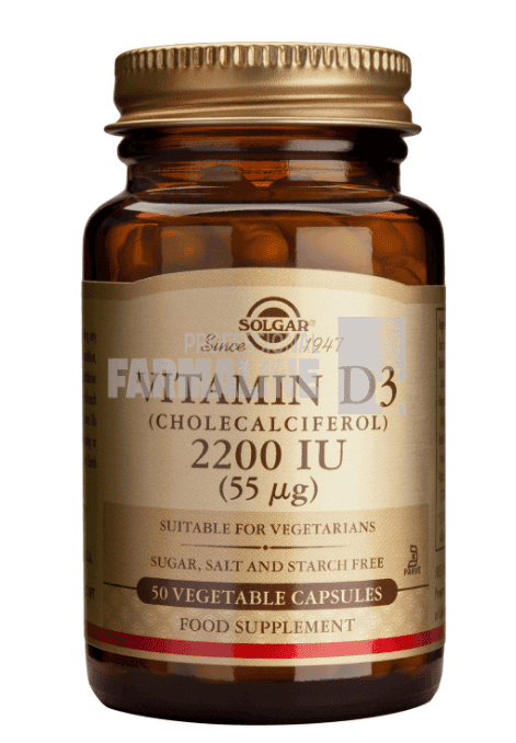 DescriereForma activa a vitaminei D3 are un rol in activarea a unui numar mare de procese biologice importante, cum ar fi mobilizarea calciului si fosforului din tesutul osos, stimularea formarii si a depunerii in oase a fosfatului de calciu, absorbtia calciului si fosforului din alimentatie, in functionarea glandelor tiroide si paratiroide.Este considerata de asemenea deosebit de utila in combaterea simptomelor osteoporozei.Contribuie la absorbtia de calciu si fosfor a oaselor;Sporeste nivelul de calciu din sange;Contribuie la buna functionare a sistemului imunitar;Contribuie la sanatatea oaselor, muschilor si dintilor, ajutand la dezvoltarea si mentinerea metabolismului normal al calciului si al fosforului;Contribuie la functionarea corespunzatoare a glandei tiroide si a sistemului nervos.CompozitieVitamina D3 (2200 UI, sub forma de colecalciferol) 55 µg.Mod de administrareProdusul poate fi consumat de vegetarieni.A se administra ca supliment alimentar pentru adulti, o capsula vegetala pe zi, preferabil in timpul mesei.ProducatorSolgarMod de prezentareFlacon 50 capsule
