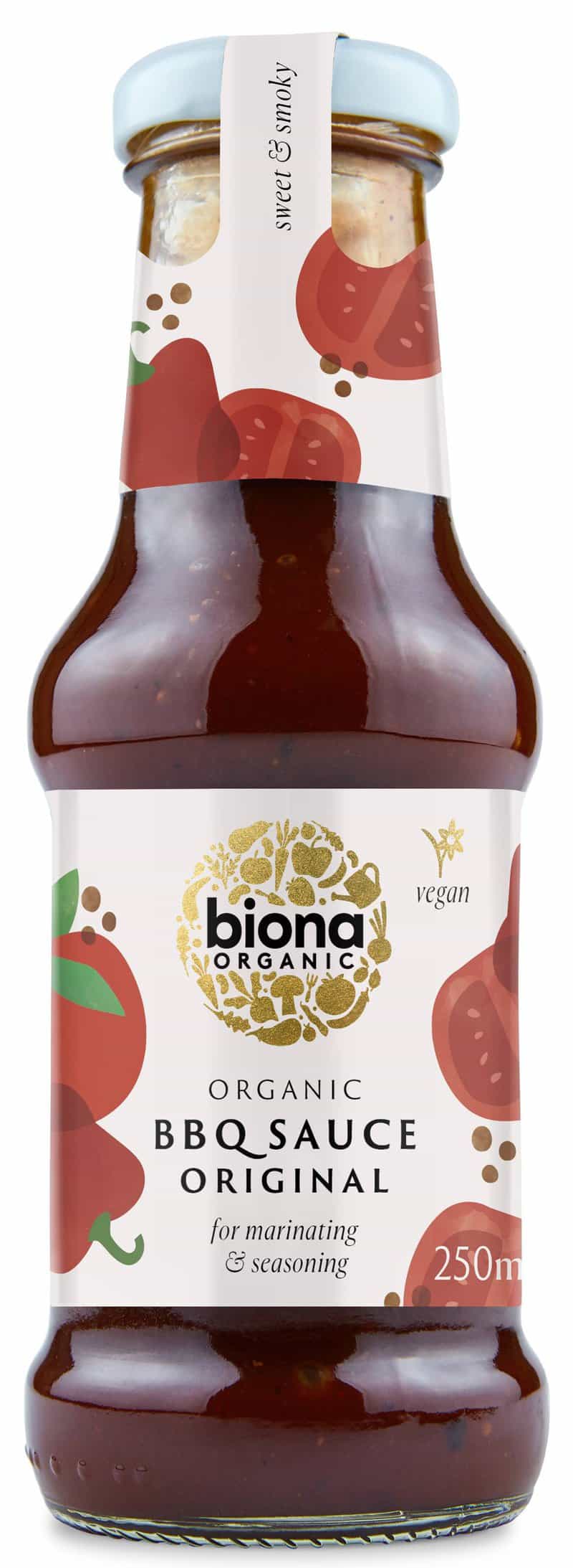 Sos barbecue Original, eco-bio, 250ml – Biona Sos barbecue, ideal pentru a marina si a condimenta preparatele pentru gratar. Ingrediente: apa, zahar*, piure de rosii*, otet*, amidon din porumb*, sare, sirop de zahar caramelizat*, piper*, usturoi*, semint