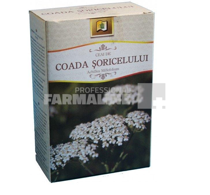 DescriereAcest ceai de coada soricelului are proprietati antiseptice si este recomandat in foarte multe afectiuni. In principal, acesta calmeaza afectiunile stomacului si intestinelor cum sunt enterocolitele si gastritele. Calmeaza colicile stomacale, ajuta la eliminarea gazelor si restabileste pofta de mancare. Cresterea apetitului se datoreste unui principiu amar prezent in frunze, care poarta numele de achileina si care are proprietati tonice. Infuzia de coada-soricelului stimuleaza si secretia de acizi biliari calmand astfel spasmele hepatice. O alta proprietate deosebita a acestui ceai de coada soricelului – flori, este reglarea menstruatiei neregulate, datorita princiipiilor active care reduc hemoragiile abundente si calmeaza durerile. Pentru hemoroizi se recomanda amestecul de coada soricelului cu frunzele de urzica iar in cazul constipatiilor se poate adauga coaja de crusin.CompozitieFloare coada soricelului maruntitaMod de administare50 ml apa fiarta se toarna peste o lingurita cu varf de planta. Se lasa 1/2 de minut si se strecoara. Infuzia se mai poate folosi si extern sub forma de bai sau comprese avand efecte calmante, antiinflamatoare si dezinfectante, regenereaza tesuturile, calmeaza tenurile inrosite si iritate.ProducatorStefMarMod de prezentareCutie 50 g