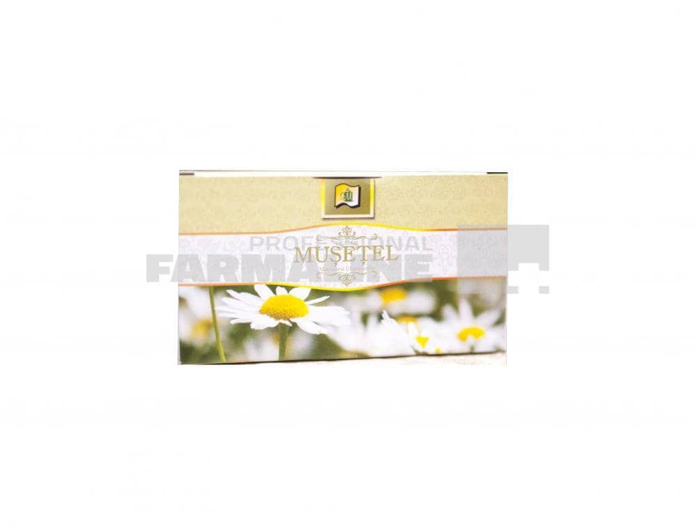 DescriereCeai muşeţel prezenta proprietăţi antispasmolitice, antiinflamatoare, anxiolitice, analgezice, antialergice, anestezice locale, antiseptice, emoliente şi cicatrizante.Ameliorează durerile de stomac şi simptomele sindromului de intestin iritabil, precum şi refluxul gastroesofagian, crampele specifice sindromului premenstrual, balonarea şi durerile de încheieturi, iar asta se datorează uleiurilor esenţiale precum alfa-bisabolol şi matricină, care au proprietăţi antiinflamatorii.De asemenea, ceaiul de muşeţel este excelent pentru prevenirea răcelilor de sezon şi pentru întărirea sistemului imunitar, datorită substanţelor cu efect antibacterian şi detoxifiant.Muşeţelul face minuni şi în cazul persoanelor care se confruntă cu insomnii şi anxietate. O ceaşcă de ceai de muşeţel băută cu 30-45 de minute înainte de culcare te va ajuta să te relaxezi şi să ai un somn odihnitor.Dacă ai probleme cu dantura (gingivite, abcese dentare, stomatite, afte), infuzia de ceai de muşeţel este ideală (se ţine în gură infuzia călduţă timp de 5 minute).CompozitieFlori de musetel (Chamomillae flos)Mod de administrareUz intern: infuzie din 1-2 plicuri. Uz extern: infuzie concentrata din 2-4 plicuri. Cosmetica: infuzie concentrata din 5-7 plicuri.ProducatorStefMarMod de prezentareCutie cu 20 plicuri