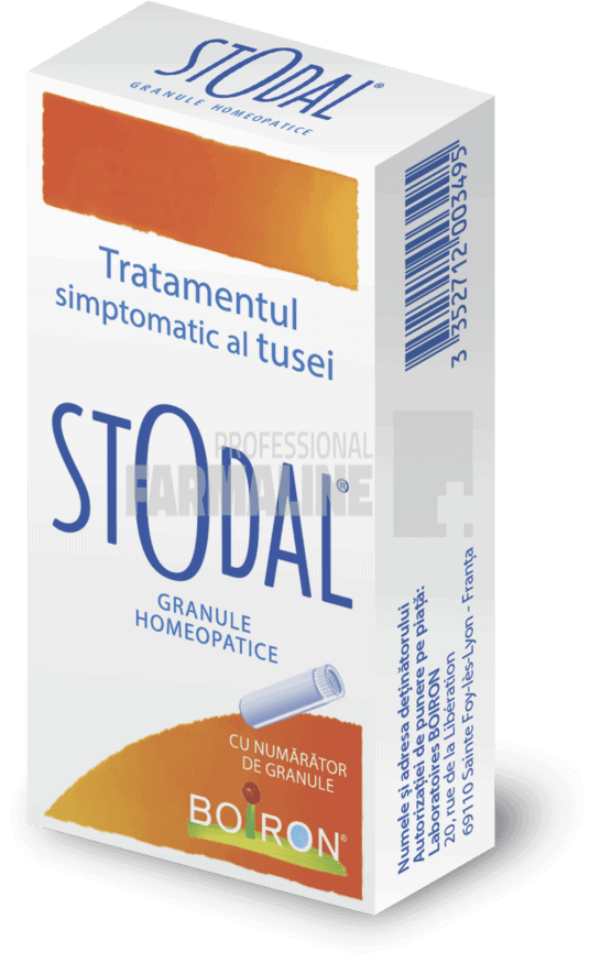 DescriereStodal comporta o asociere de compusi homeopatici care sunt utilizati in tratamentul simptomatic al tusei productive si/sau neproductive. Nu contine codeina, nu da stare de somnolenta sau de oboseala, putand fi utilizat si de persoanele care conduc autovehicule sau opereaza masini-unelte. Nu are efecte secundare sau contraindicatii. Nu are interactiuni medicamentoase. Poate fi administrat tuturor: adulti, copii, femei insarcinate, sugari, varstnici. CompozitieAnemone pulsatilla 6 CH 0,95 g, Rumex crispus 6 CH 0,95 g, Bryonia dioica 3 CH 0,95 g, Ipecacuahna 3 CH 0,95 g, Spongia tosta 3 CH 0,95 g, Sticta pulmonaria 3 CH 0,95 g, Antimonium tartaricum 6 CH 0,95 g, Myocarde 6 CH 0,95 g, Coccus cacti 3 CH 0,95 g, Drosera TM 0,95 g, Sirop de Tolu 19 g, Sirop de Polygala 19 g. Excipienti q.s.p. 100 g. Mod de administrareDoza recomandata este de 5 granule din ora in ora. Acestea se adminstreaza sublingual si se lasa sa se topeasca. Dupa ameliorarea simptomelor se rareste administrarea. ProducatorBoironMod de prezentareTub 4 g