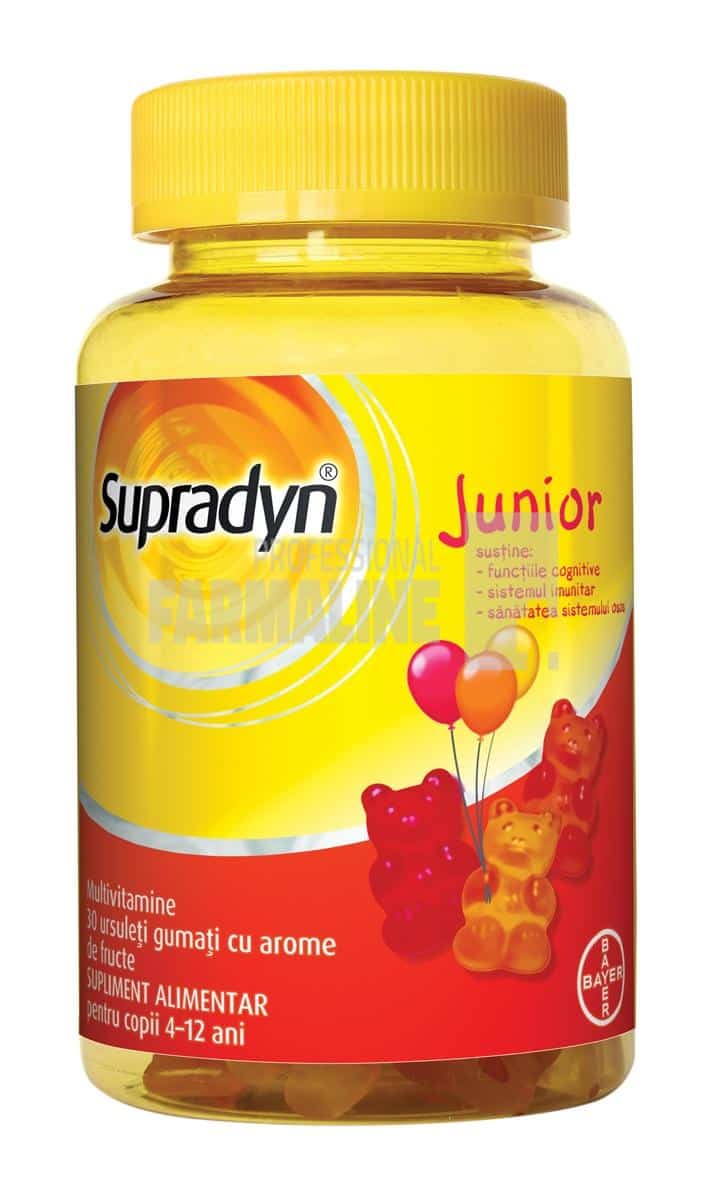 Descrierea pe larg a produsului: Ofera-i copilului tau cel mai bun inceput cu multivitaminele Supradyn Junior. Ajuta-l sa se dezvolte fizic si mental si sa-si atinga potentialul maxim. Supradyn Junior ursuleti gumati sunt o modalitate minunata si distractiva de a va ajuta copilul sa profite la maximum de fiecare zi. Fiecare ursulet gumat, cu aroma de fructe, contine vitaminele B3, B6, B12, ajuta la eliberarea energiei din alimente si incurajeaza buna functionare a metabolismului, iar vitamina C sustine sistemul imunitar, in timp ce vitamina D contribuie la dezvoltarea si mentinerea sistemului osos. Supradyn Junior este potrivit pentru toti copiii de peste 4 ani si este un supliment ideal de multivitamine pentru a fi inclus in dieta zilnica a copilului tau. Supradyn te ajuta sa ii oferi copilului tau ceea ce are nevoie pentru a se dezvolta sanatos si fericit. Caracteristici si Beneficii:1. Ofera-i copilului tau un impuls de energie atunci cand are nevoie, special conceput pentru a-i sustine dezvoltarea;3. Vitaminele B3, B6 si B12 sustin metabolismul energetic;4. Ursuleti gumati cu gust deosebit, cu aroma de fructe, sunt distractive pentru copii;5. Potrivit pentru copiii cu varsta peste 4 ani.Mod de administrare: Copii 4-12 ani: 1 ursulet gumat pe zi. Acest supliment alimentar se administreaza conform etichetei/informatiilor de pe ambalaj si conform recomandarilor medicului sau farmacistului.Ingrediente active:Fiecare ursulet gumat contine Vitamina A 400 μg, Vitamina D3 2.5 μg, Vitamina E 5 mg, Vitamina C 30 mg, Nicotinamida 9 mg, Biotina 75 μg, Vitamina B12 0.5 μg, Vitamina B6 1 mg, Acid folic 100 μg.Pentru lista completa de ingrediente te rugam sa consulti prospectul.Precautii:Nu se utilizeaza Supradyn Junior in caz de hipersensibilitate (alergie) la oricare dintre componentele produsului. A nu se depasi doza recomandata pentru consumul zilnic. Produsul este un supliment alimentar si nu trebuie sa inlocuiasca o dieta variata, echilibrata si un stil de viata sanatos. Contine zahar. Continut de sodiu mai putin de 8 mg. Acesta este un supliment alimentar. Citeste intotdeauna informatiile de pe ambalaj/prospect inainte de utilizare. Discuta cu medicul sau cu farmacistul daca ai neclaritati.Mod de prezentare:Cutie cu un flacon a 30 de ursuleti gumati