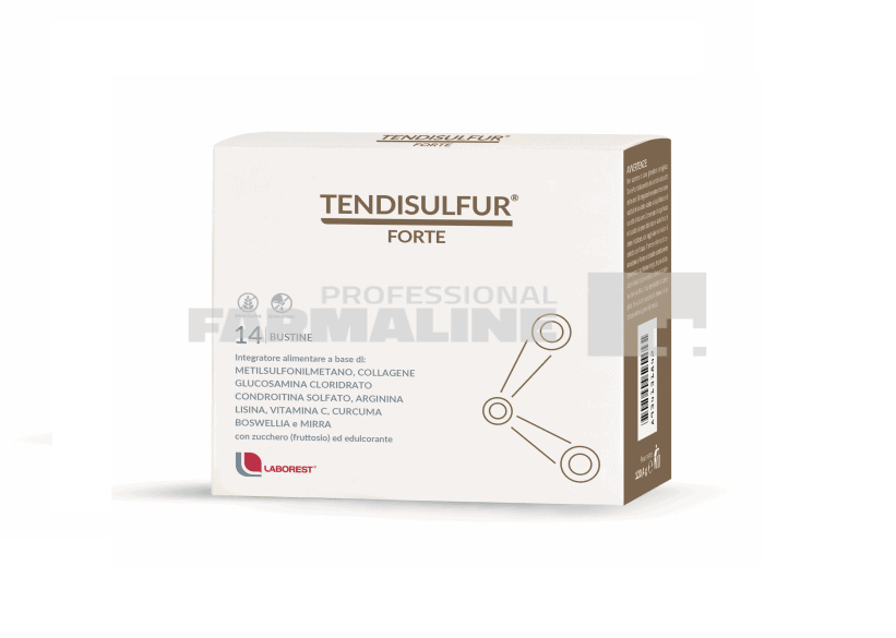 DescriereStructurile tendonului au ca principala functie transmiterea fortei exercitate de contractiile musculare asupra aparatului scheletal la care sunt anexate, transformand aceasta energie intr-o forma utila miscarii corpului nostru.Avand in vedere functia caracteristica pe care trebuie sa o indeplineasca, tendoanele sunt dotate cu o inalta capacitate elastica si de rezistenia.Fiecare tendon este format din colagen, o substanta foarte rezistenta, si elastina, o proteina care ofera elasticitatea.Ligamentele, pe de alta pa rte, sunt formatiuni de tesut conjunctiv fibres care reunesc doua sau mai multe structuri anatomice.Tendoanele si ligamentele sunt supuse stresului constant datorita factorilor legati de varsta, sport sau munca si pot suferi modificari structurale, cu afectarea functionalitatii si manifestari neplacute, caracteristice .Vulnerabilitatea acestora si timpul de recuperare functionala creste in cazul deficientului de microelementelor nutritive utile pentru starea de bine a tendonului si a ligamentului insusi.CompozitieMETILSULFONILMETANUL ( MSM ) este un donator direct de Sulf biologic activ.COLAGENUL este fundamental la nivelul tendoanelor, constituind de la 95 la 99% din structura acestora.SULFATUL DE GLUCOZAMINA si SULFATUL DE CONDROITINA sunt structuri polizaharidice cu activitate viscoelasticil la nivelul diferitelor districte ale corpului, cum ar fi cartilajul si jonctiunile tendoanelor si osteotendoanelor.Mod de administrare2 plicuri pe zi, dupa mesele principale ( pranz, cina) , pentru eel putin 2 saptamani, a poi 1 plic pe zi, la nevoie. Se varsa continutul plicului intr-un pahar cu apa, se omogenizeaza si se bea imediat.Tendisulfure Forte poate sa fie administrat si la persoane cu intoleranta sau sensibilitate la gluten si la lactoza.ProducatorMedimow Mod de prezentareCutie cu 14 plicuri