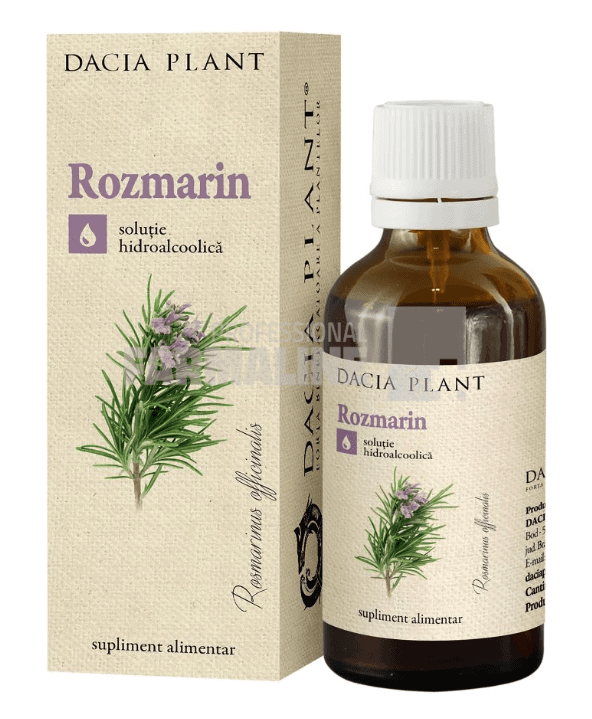 DescriereProdusul este recomandat pentru mentinerea tensiunii arteriale in limite normale, normalizarea circulatiei periferice si cerebrale, sustine secretia si eliminarea bilei si combate spasmele intestinale.- contribuie la sustinerea digestiei si la confortul digestiv,- sustine drenajul hepatobiliar,- util la sustinerea functiilor de purificare ale organismului,- sustine metabolismul colesterolului.CompozitieExtract 1:4 in solutie hidroetanolica (raport alcool etilic 96⁰/apa: 45/55); din frunze de rozmarin (Rosmarinus officinalis)(20%). Produsul nu contine conservanti si coloranti artificiali.Mod de administrareIntern:Copii intre 3 si 12 ani: cate 10-15 picaturi de 3 ori pe zi.Copii si tineri intre 12 si 18 ani: cate 15-20 picaturi de 3 ori pe zi.Adulti: cate 30 picaturi de 3 ori pe zi.ProducatorDacia PlantMod de prezentareFlacon 50 ml