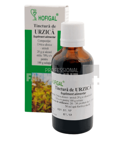 Descriere- asigură un aport bogat de nutrienți și substanțe bioactive necesar în suplimentarea dietei pentru restabilirea funcționării normale a aparatului reno-urinar și a prostatei, pentru înlăturarea tulburărilor de micțiune;- contribuie la creșterea volumului de urină zilnic, stimulând eliminarea pe cale urinară a excesului de lichide din organism și favorizează eliminarea pe cale renală a acidului uric;- este un bun drenor al excesului de uree, acid uric și creatinina din sânge;- ajută la detoxifierea unor țesuturi și organe prin eliminarea substanțelor toxice din sânge;- stimulează hematopoieza, susține creșterea cantității de hemoglobină și a numărului de globule roșii din sânge în cazul unor carențe de fier in organism;- contribuie la stimularea secreției gastrice și a digestiei, a peristaltismului intestinal;- are influența pozitivă în demineralizări osoase, în probleme la nivelul articulațiilor;- favorizează stimularea lactației, determină refacerea organismului după naștere;- ajută la oprirea sângerărilor (sângerări nazale, sângerări vaginale survenite în afara fluxului menstrual), cu influența pozitivă asupra ciclului menstrual (în cazul unor sângerări menstruale abundente);- ca imunostimulent sprijină creșterea rezistenței organismului față de diferiți contaminanți;- are efect tonic general și de fortificare a organismului în stări de oboseală, slăbiciune, stări de nervozitate, epuizare;- este fitogeriatric, asigură starea generală de bine.Compozitie20 g pulbere din părțile aeriene deUrzică (Urtică dioică)și alcool etilic 70% v/v pentru 100 g soluție.Mod de administrare- câte 20-30 picături de 1-3 ori pe zi , diluate în 50 ml apă fiarta și răcită.După diluare, concentrația de alcool scade la un nivel de concentrație homeopatică și nu comporta contraindicații legate de toxicitatea acestuia.ProducatorHofigalMod de prezentareFlacon 50 ml