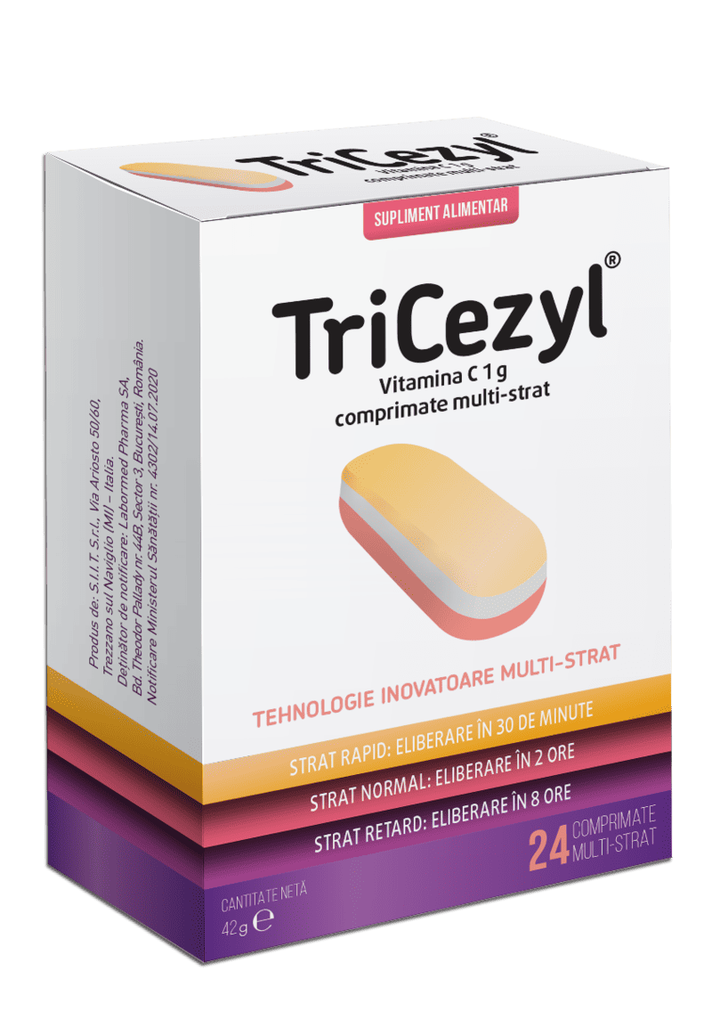Tricezyl este un produs inovator cu Vitamina C 1 g, singurul din piata cu eliberare prelungita pana la 8 ore datorita tehnologiei de comprimat multi-strat.