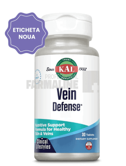 DescriereSupliment alimentar Vein Defense™ 30tb, KAL, 30 tablete pe baza de extracte din plante si vitamina C pentru sustinerea circulatie venoaseFormula avansata pe baza de extracte din plante si ingrediente patentate, conceputa pentru a sustine circulatia venoasa normala, inclusiv de la nivelul membrelor inferioare.sustinerea circulatiei sangvine venoase si limfatice in manifestari de tipul circulatie periferica deficitara, senzatie de picioare obosite si alte manifestari de la nivelul sistemului circulator si muscular:ofera o senzatie de usurare a picioarelor obositementine structura si buna functionare a capilarelor (suport in reducerea fragilitatii acestora) si a musculaturii netedementine functia endoteliala in parametri normali (ofera suport in fata procesului inflamator)mentine tonusul si integritatea peretilor si valvelor venoase in fata actiunii radicalilor liberisustine procesul normal de agregare plachetarasuport in formarea colagenului pentru functionarea normala a vaselor de sangesustinerea sanatatii inimii:mentine fluxul sangvin arterial normal si contractilitatea normala a muschiului cardiacsustine metabolismul celular normalsuport in mentinerea valorilor normale ale presiunii arterialeformarea colagenului pentru sustinerea functiilor normale ale pieliCompozitieVitamina c 400 mg, Castan salbatic (Aesculus hippocastanum)(extract standardizat din seminte 12:1, garantat 70mg [20%] aescin) 350 mg, Gotu kola (Centella asiatica)(partea aeriana) 250 mg, Hesperidin (concentrat din Portocal-amar/Citrus aurantium) 200 mg, Bioflavonoide (concentrat din citrus spp.) 200 mg, Quercitina 200 mg, Amestec concentrat de tocoferoli (surse naturale d-alfa, d-beta, d-gamma, d-delta tocoferoli din ulei de soia) 200 mg, Ghimpe (Ruscus aculeatus)(extract din radacina) 150 mg, Turmeric (Curcuma longa)(extract din radacina) 50 mg, Bromelaina (din Ananas [Ananas comosus], garantat 125 GDU [2500 GDU/g]) 50 mg Rutin (concentrat din muguri florali de Salcam-japonez/Sophora japonica) 50 mg, Extract standardizat din vin rosu frantuzesc (garantat trans-resveratrol 2.5mg [5%], combinatie de polifenoli cu proantocianidine [OPCs] 25mg [50%]) 50 mg, Amestec actisorb®:, Bioperine® (extract din Piper-negru)(Piper nigrum), Ghimbir (Zingiber officinale)(extract din radacina), Rozmarin (Rosmarinus officinalis)(extract din frunza), Turmeric (Curcuma longa)(extract din radacina), Ardei-iute Cayenne (Capsicum annuum)(extract din fruct) 10 mgMod de administrare 2 tablete/zi, la masa, cu 200ml de apa sau conform recomandarii consultantului de specialitate.Pentru a obtine rezultatele dorite se recomanda asocierea cu Vein Defense™ Cream.ProducatorSecomMod de prezentare Flacon 30 tablete
