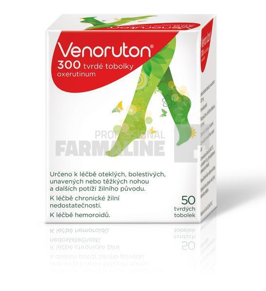 DescriereDurere si edem asociate varicelor stabilizate; varice si hemoroizi in timpul sarcinii (dupa cea de a patra luna). Edeme si alte simptome ale insuficientei venoase cronice, sindrom posttrombotic, tulburari trofice, dermatita varicoasa, ulcer varicos. Adjuvant in tratamentul de sclerozare a varicelor. Hemoroizi si complicatiile acestora.Venoruton actioneaza pe peretele capilar, crescandu-i rezistenta si normalizandu-i permeabilitatea. Are efect inhibitor asupra agregarii eritrocitare si actiune protectiva pe endoteliul vascular. Venoruton se indica in tratamentul insuficientei venoase cronice prin reducerea edemelor si atenuarea simptomelor precum durere, crampe, tulburari trofice, dermatita varicoasa si ulcer varicos.CompozitieVenoruton 300mg se indica in tratamentul insuficientei venoase cronice prin reducerea edemelor si atenuarea simptomelor precum durere, crampe, tulburari trofice, dermatita varicoasa si ulcer varicos.Contine O-(-hidroxietil)-rutosid 300 mg.Mod de administrare2-3 capsule de Venoruton 300 zilnic, dupa mese. Dupa disparitia simptomelor, de obicei in 2-4 saptamani, se recomanda continuarea tratamentului pentru alte cateva saptamani pentru consolidarea rezultatelor obtinute.Doza de Venoruton nu are practic prag, ceea ce face posibila cresterea dozei, corespunzator fiecarui caz individual.ProducatorGlaxoMod de prezentareCutie cu 50 capsule