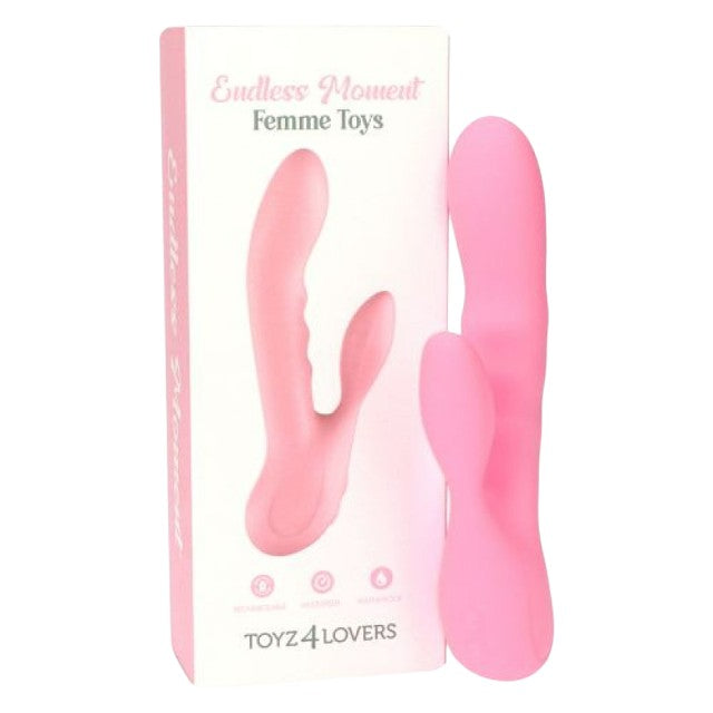 Vibrator Toyz4lovers - EndlessMoment Femme Toys, ideal pentru a stimula clitorisul si vaginul, roz Descoperă o nouă dimensiune a plăcerii cu Endless Moment – un vibrator de tip iepuraș, care îți va deveni rapid muza intimă. Construit pentru a-ți oferi o experiență de neuitat, acest dispozitiv îmbină puterea remarcabilă și designul inovator pentru o stimulare intensă și simultană a clitorisului și vaginului. Caracteristici principale: