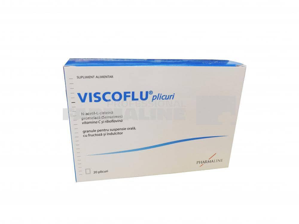 DescriereViscoflu contine N-acetil-L-cisteina in combinatie cu promelaza (Serrazimes, enzima proteolitica derivata din fermentatia controlata a maltodextrinei cu Aspergillus melleus si aspergillus oryzae), prercum si vitaminele C si B2 (ribloflavina), care contribuie la protejarea celulelor impotriva stresului oxidativ. In plus, vitamina B2 contribuie la mentinerea sanatatii membranelor mucoase, iar vitamina C la funtionarea normala a sistemului imunitar.CompozitieN-acetil-L-cisteina – 300 mg din care cisteina – 222.72 mg, vitamina C – 200 mg, promelaza – 33 mg, riboflavina – 1.4 mgMod de administrareAdulti si copii peste 3 ani: 1 plic pe zi sau conform indicatiilor medicului sau ale farmacistului.ProducatorPharmalineMod de prezentareCutie cu 20 plicuri
