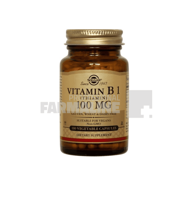 DescriereVitamina B1 – tiamina – actioneaza ca o coenzima, necesara pentru conversia carbohidratilor in glucoza, aceasta din urma fiind arsa in organism pentru energie. Este esentiala pentru functionarea sistemului nervos, iar carenta de vitamina B poate cauza beri beri, o boala caracterizata de slabiciune, paralizie si edem. CompozitieTiamina (vitamina B1, sub forma de tiamina HCl) 100 mg 9091-% VNR.Mod de administrareA se administra ca supliment alimentar pentru adulti, o (1) capsula vegetala pe zi, preferabil in timpul mesei, sau conform recomandarilor medicului sau farmacistului.ProducatorSolgarMod de prezentareFlacon 100 capsule