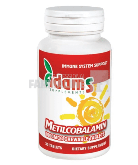 DescriereMetilcobalamina este cea mai activa si cea mai rapid absorbabila forma a vitaminei B12.Metilcobalamina este o forma activa a vitaminei B12. Pentru utilizarea eficienta a metilcobalaminei, vitamina B12 va fi transformat sub efectul enzimei MTTR. Studiile au demonstrat faptul ca vitamina B12, sub forma de metilcobalamina, este activata in mod direct prin absorbtie.In metamolismul multora, conversia endogena este insuficienta ca urmare a anormalitatilor regasite la nivelul genelor aferente enzimei MTTR, cat si in cazul afectiunilor de tipul diabetului sau anemiei pernicioase.Metilcobalamina este o forma a vitaminei B12, care contribuie la o stare de bine generala, ajuta la o buna functionare a memoriei si al inimii, sporeste sanatatea pielii, a parului si a digestiei. Este esentiala pentru mentinerea sanatoasa al sistemului nervos si cardiovascular.Un nivel scazut de metilcobalamina poate avea o multitudine de efecte negative, precum oboseala cronica, stresul cronic, lipsa de concentratie, poate afecta digestia si sistemul cardiovascular.Deficienta de vitamina B12, sau de metilcobalamina, este cel mai des intalnita la cei care tin o dieta vegetariana, deoarece alimentele in care se regaseste sunt in special carnea de vita si miel, ouale si pestele. Desigur, nu rar se regasesc persoane care asimileaza mult mai greu vitaminele, de aceea, in special acestora le este indicata metilcobalamina, care este mult mai activa si se absoarbe mult mai rapid si usor in corp.Beneficii:- absorbtie rapida;- combate anemia;- protejeaza neuronii;- ofera o stare de bine generala;- combate oboseala cronica;- ajuta la prevenirea diabetului;- ajuta la prevenirea afectiunilor cardiace.CompozitieVitamina B12 (metilcobalamina) 1000mg, agenti de ingrosare (sorbitol, manitol, croscarmeloza sodica), indulcitor (fructoza), aroma naturala (cirese), lecitina, agenti antiaglomeranti (sterat de magneziu vegetal, dioxid de siliciu).Mod de aministrareCa supliment alimentar masticati zilnic 1 tableta dupa masa principala. A nu se depasi doza recomandata zilnic.ProducatorAdams VisionMod de prezentareFlacon 30 tablete