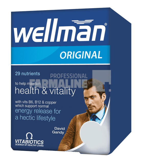 DescriereVitaminele B6, B12 si cuprul contribuie la sustinerea metabolismului energetic normal.Vitaminele C, D si B12 contribuie la functionarea normala a sistemului imunitar.Acidul pantotenic contribuie la reducerea oboselii si extenuarii.Zincul contribuie la mentinerea reproducerii normale si la mentinerea concentratiilor normale de testosteron din sange.CompozitieGinseng Siberian extract 4:1 20 mg, Coenzima Q10 2 mg, L-Carnitina 30 mg, Bioflavonoide din citrice 10 mg, L-Arginină 20 mg, L-Methionină 20 mg, Siliciu 10 mg, Beta-caroten 2 mg, PABA 20 mg Vitamina A (2500 IU) 750 µg, Vitamina D3 (400 IU) 10 µg, Vitamina E 20 mg, Vitamina C 60 mg, Tiamină (Vitamina B1) 12 mg, Riboflavină (Vitamina B2) 5 mg, Niacină (Vitamina B3) 20 mg, Vitamina B6 9 mg, Acid folic 400 µg, Vitamina B12 9 µg, Biotină 50 µg, Acid pantotenic 10 mg, Magneziu 60 mg, Fier6 mg, Zinc 15 mg, Cupru 1 mg, Mangan 3 mg, Seleniu 150 µg, Crom 50 µg, Iod150 µg.Mod de administrareAdulti: 1 tableta pe zi, la masa principala, cu apa sau un lichid rece. A nu se mesteca. A nu se administra pe stomacul gol. Wellman® original este un produs recomandat in special barbatilor.A se pastra in loc uscat, ferit de lumina şi caldura, la o temperatura sub 25° C, in ambalajul original. A se consuma, de preferinţa, inainte de sfarsitul perioadei inscrise pe ambalaj. ProducatorVitabioticsMod de prezentareCutie cu 30 tablete